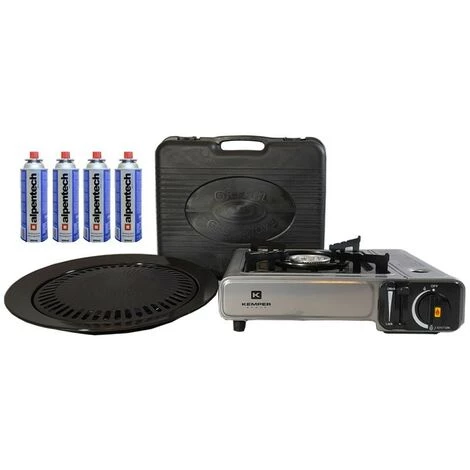 Réchaud gaz KEMPER INOX 1900W + grille barbecue. Fonctionne avec une cartouche de gaz butane standard 227 gr (4 Cartouches de gaz incluses dans ce pack)