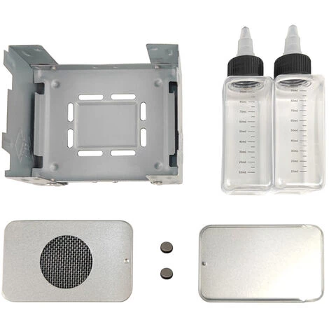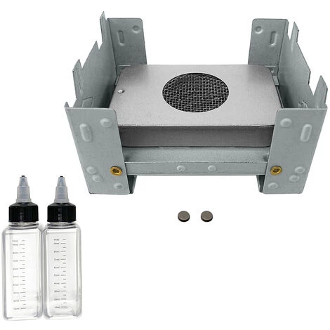 Comprend un réchaud pour alcool liquide, un réchaud pliant pour alcool solidifié et deux bouteilles d’alcool vides.