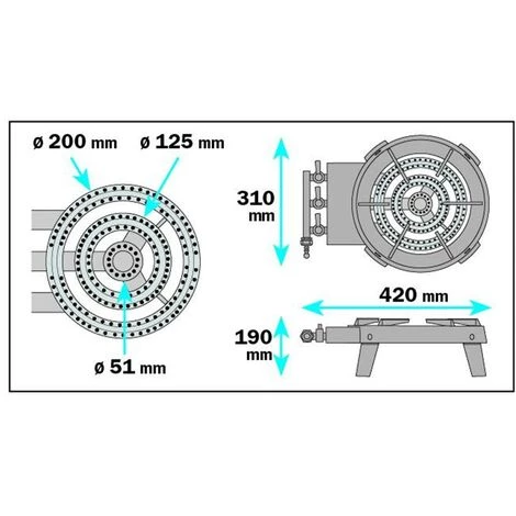 – Brûleur médian Ø 125 mm. – Brûleur intérieur Ø 51 mm. – Fonctionne sur bouteille de gaz (butane-propane). – Allumage manuel. Livré sans tuyau ni détendeur. – Dimensions hors tout ± Ø 31 x 42 x 19 cm.