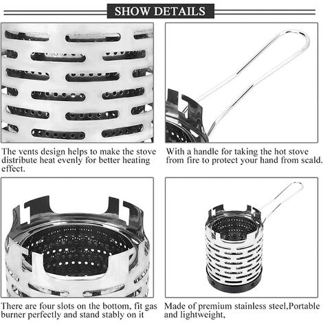 Matériau en acier inoxydable de qualité supérieure:Ce réchaud de camping portable est fabriqué en acier inoxydable de qualité supérieure, robuste, résistant à la chaleur et durable pour une utilisation à long terme. Lorsque vous campez à l’extérieur, vous aurez besoin d’un tel réchaud de camping pour vous aider à ajouter de bons souvenirs en plein air.