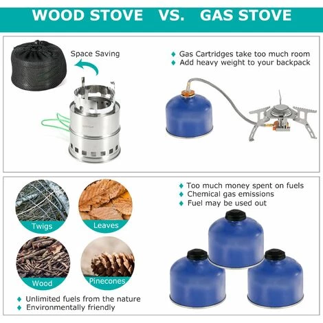 Combustibles illimités: utilisez les brindilles, les feuilles, les branches, le bois comme combustible pour cuisiner un repas lors de votre randonnée, plus d’argent dépensé en bidons de gaz, pas d’émissions chimiques et d’empreinte carbone. Le réchaud comprend un plateau pour contenir de l’alcool solide.